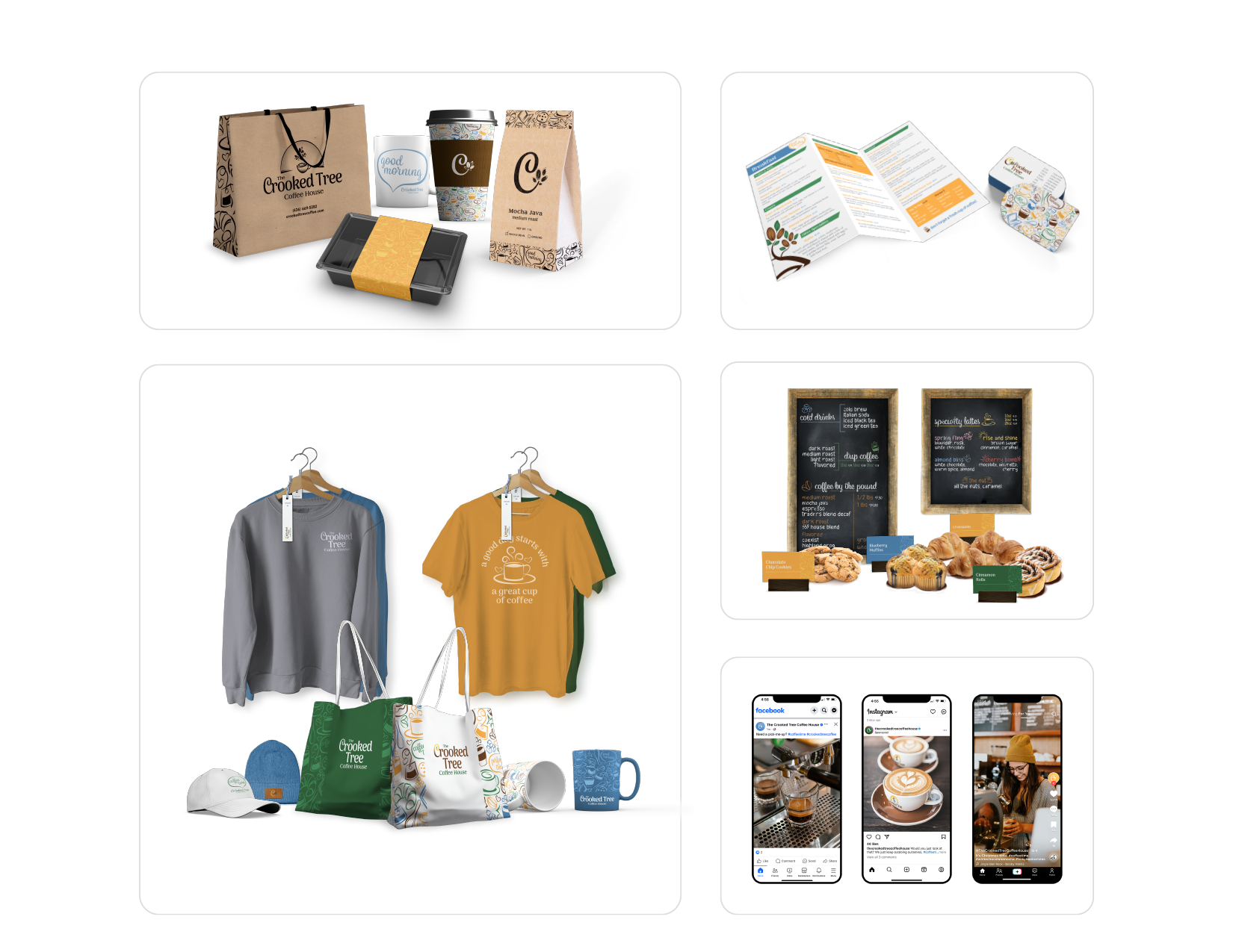Future and returning clients for The Crooked Tree Coffee House would be interacting with the brand through social media as well as in-person through their storefront. Using the defined branding elements, consistent experiences were developed across multiple platforms.