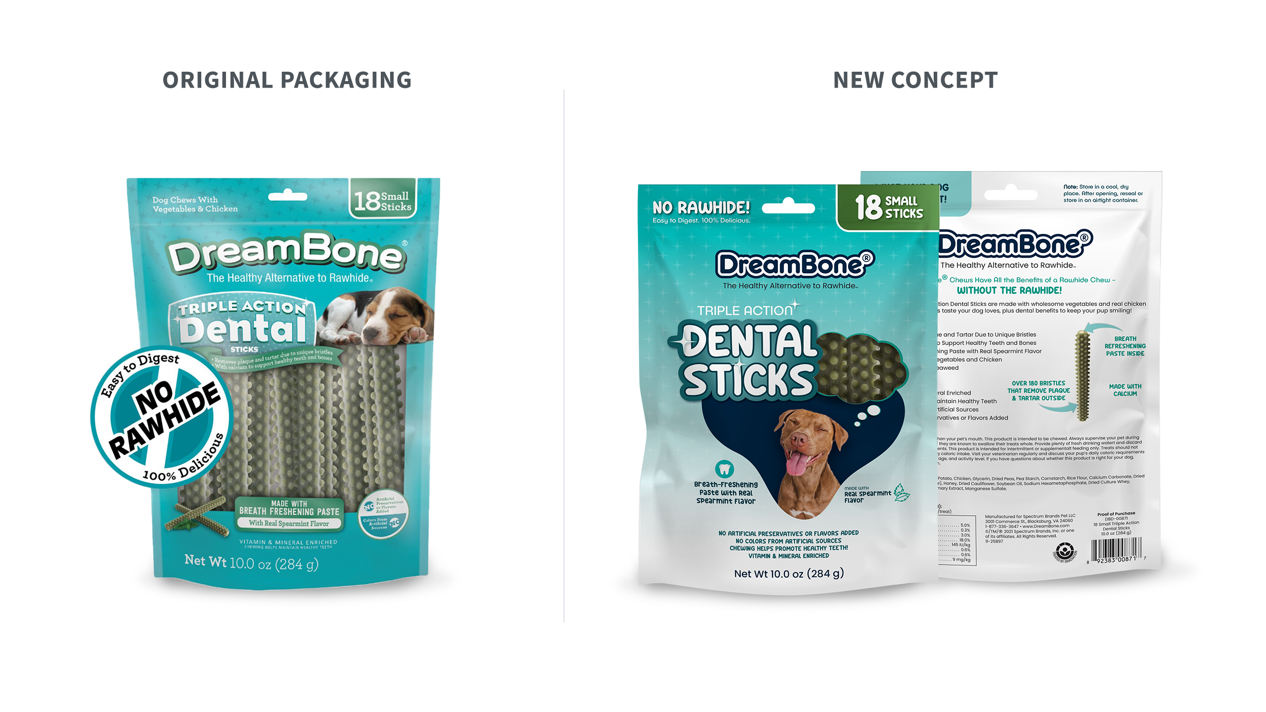 Updating the logo to a more compact rounded font brought a change to the feel of the brand without compromising brand recognition for existing customers. Creating clear windows to view product using "dream bubbles", tells the consumer that this treat is literally something their dog will dream about. The use of brighter colors will help their products stand out on retailer shelves.
