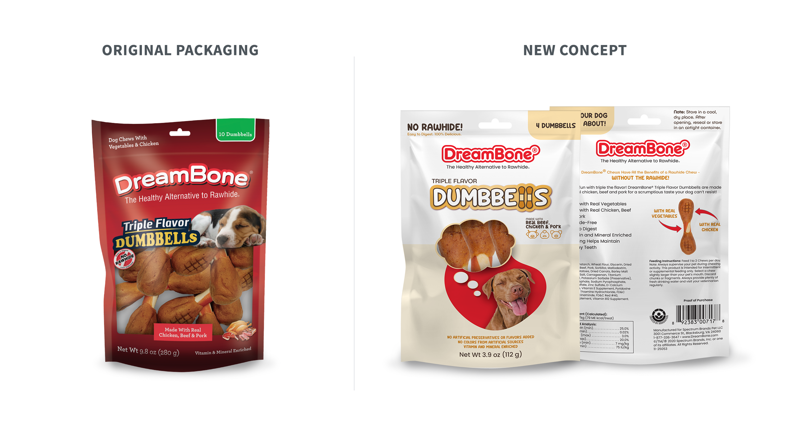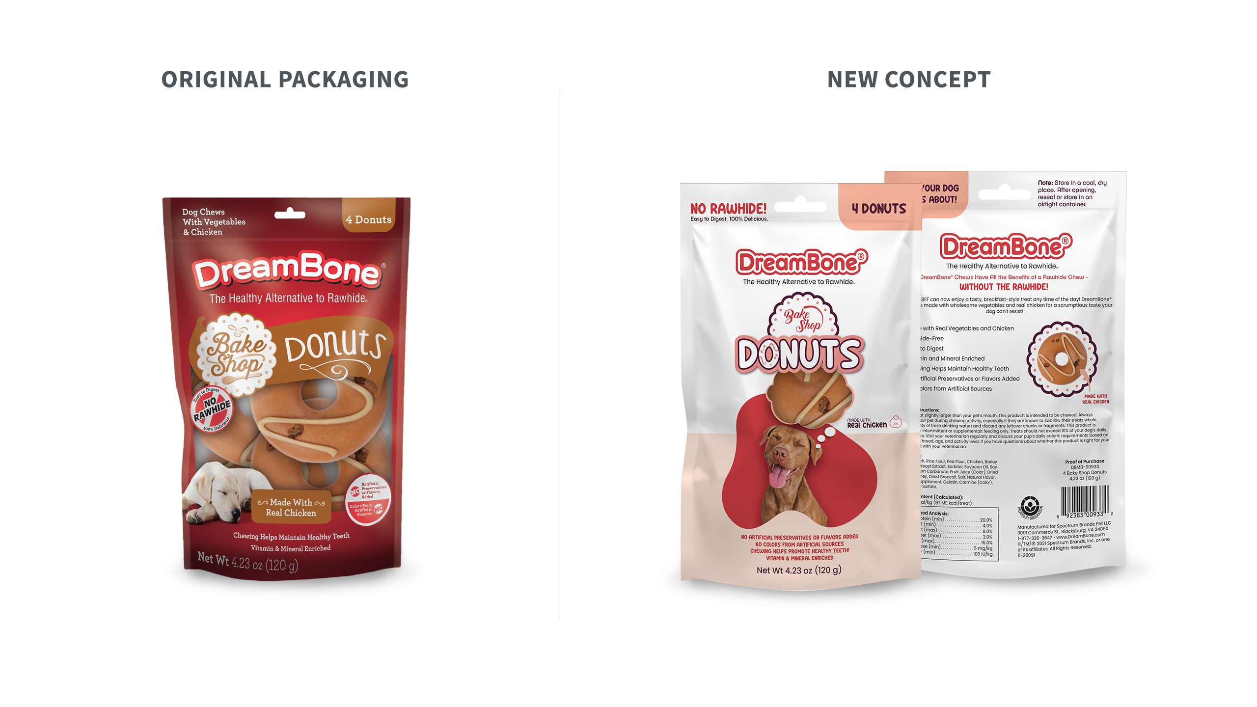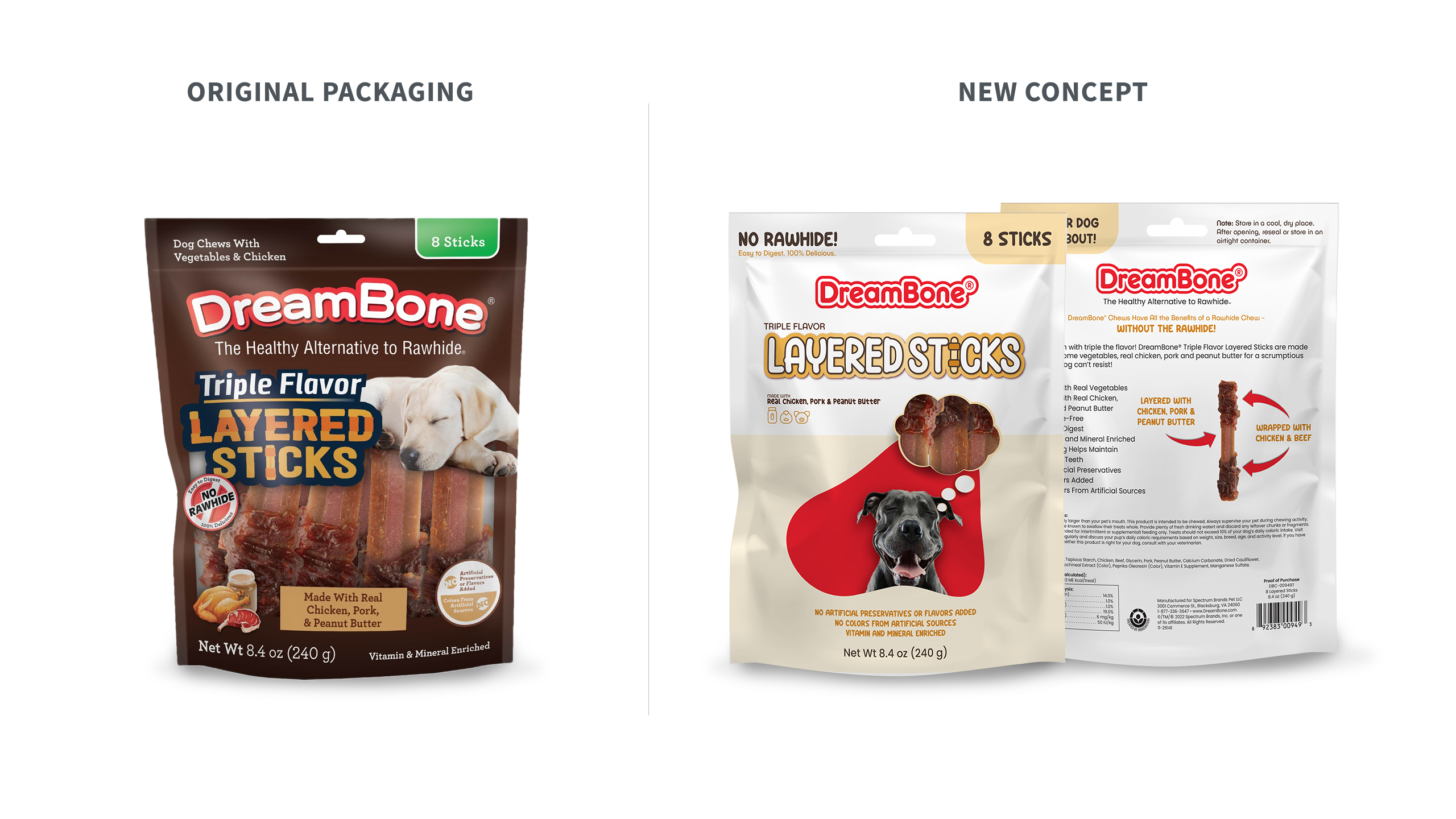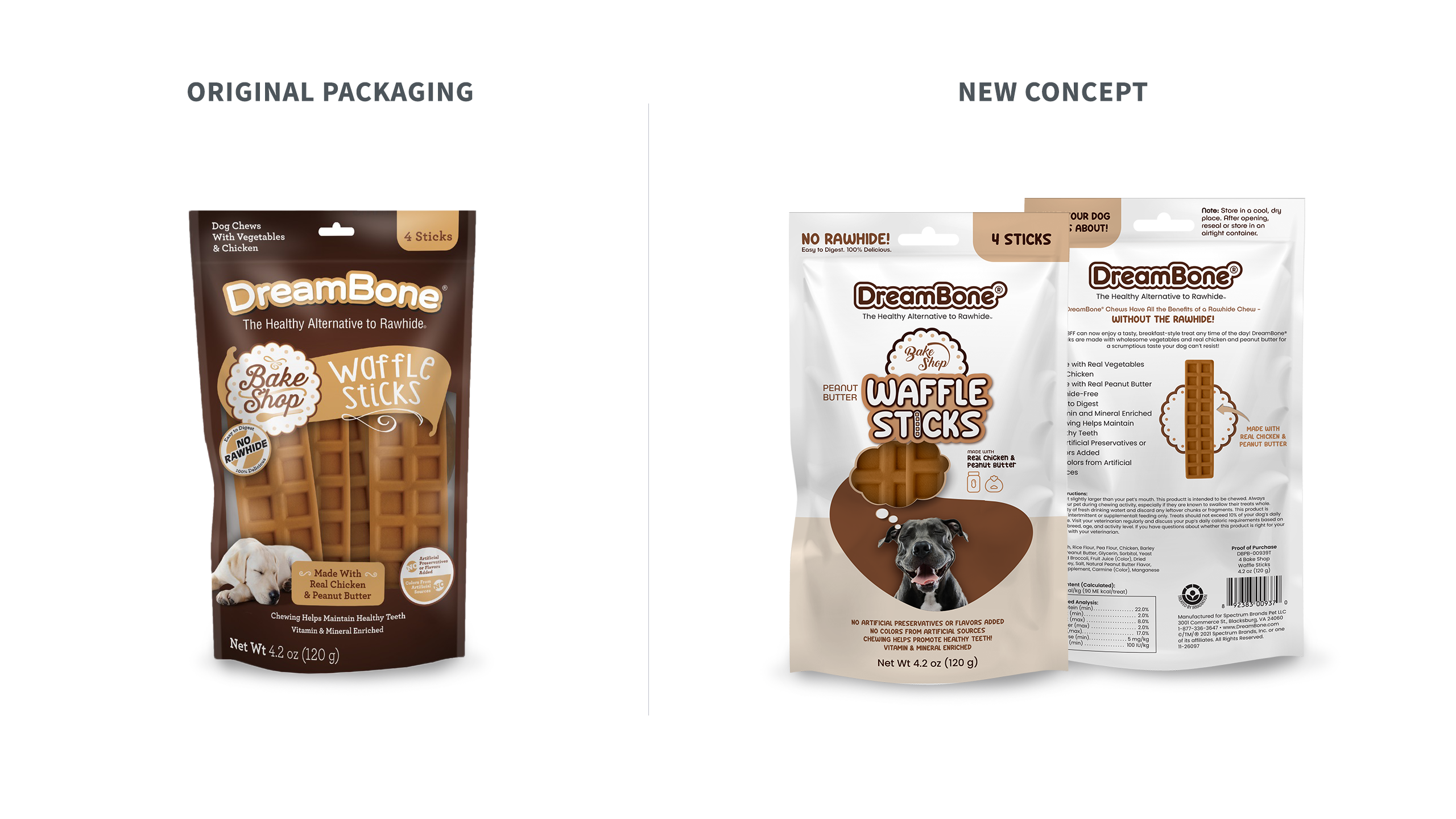 Updating the logo to a more compact rounded font brought a change to the feel of the brand without compromising brand recognition for existing customers. Creating clear windows to view product using "dream bubbles", tells the consumer that this treat is literally something their dog will dream about. The use of brighter colors will help their products stand out on retailer shelves.