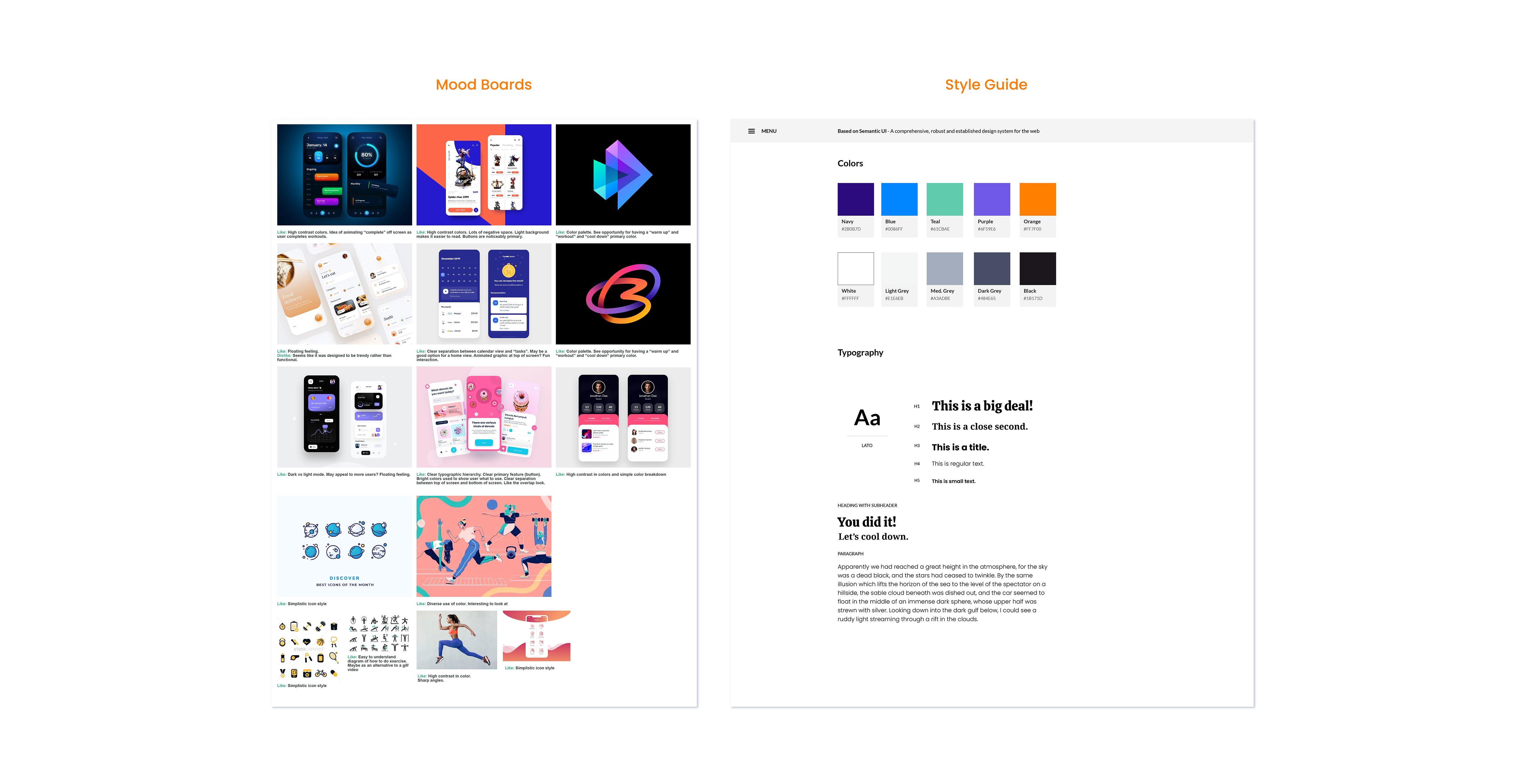 Before adding color to wireframes, the team developed mood boards and style guides. Based on insights learned during research, bright but welcoming colors were chosen to represent EasyFit.