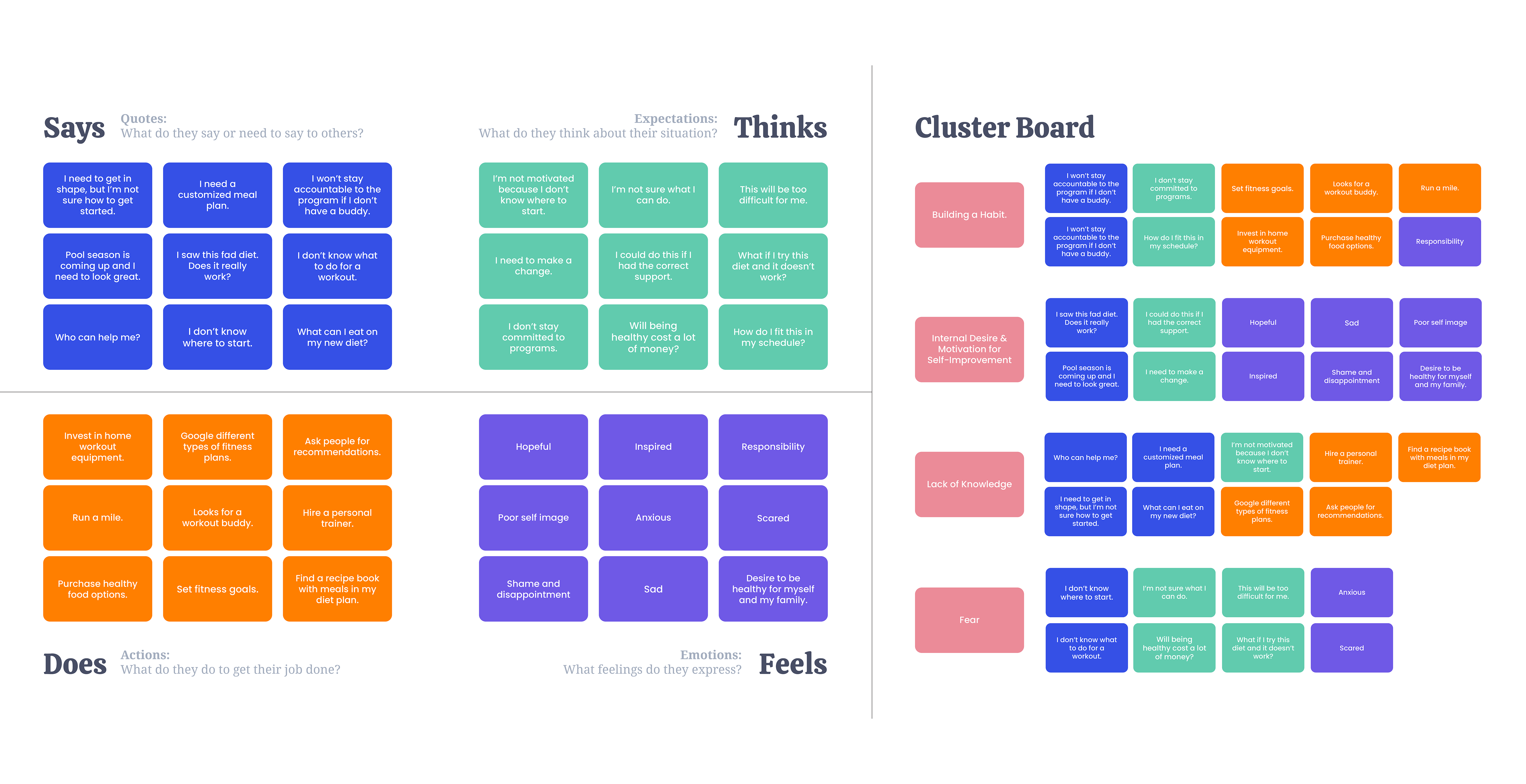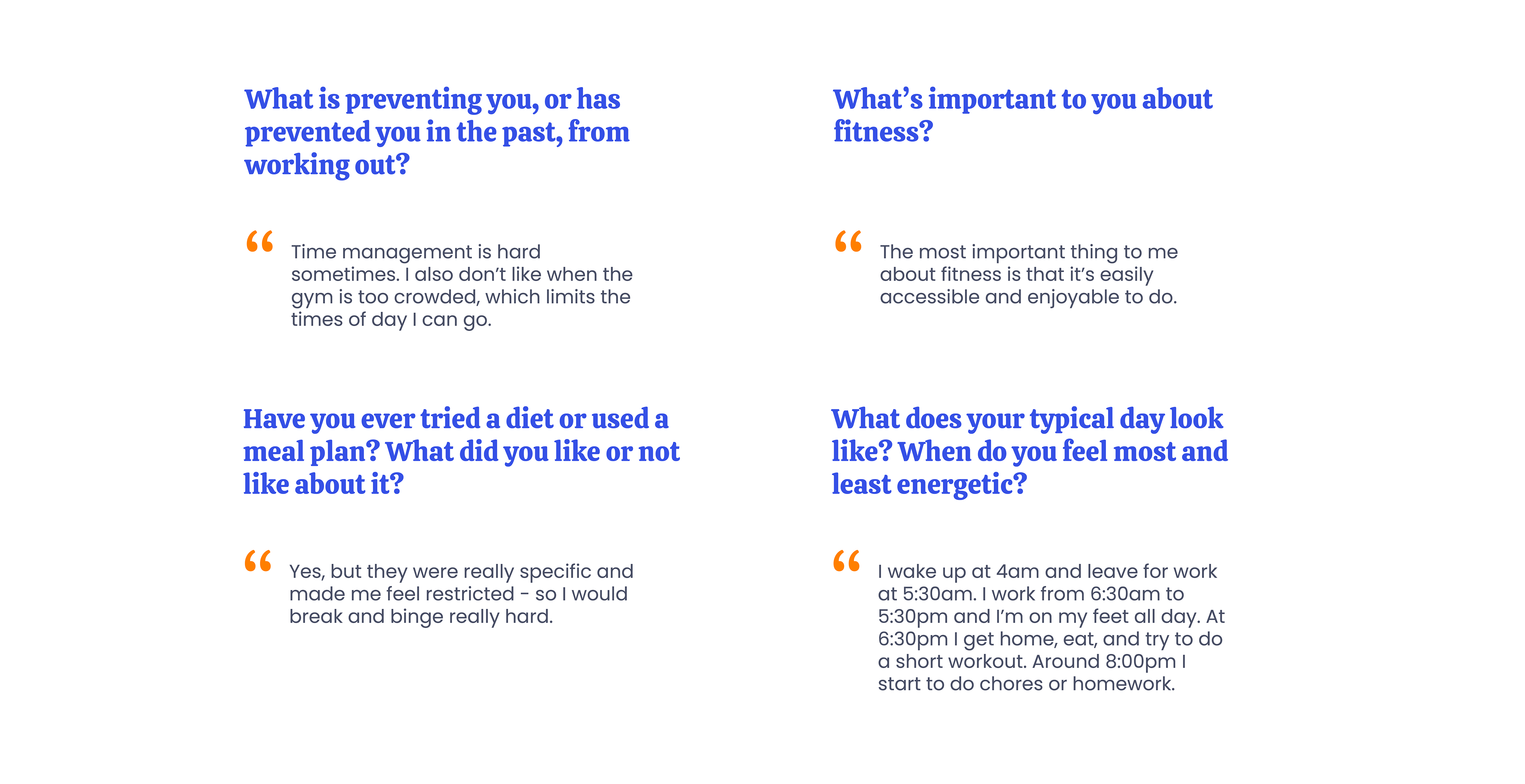 Users need to feel motivated and have a workout that is accessible anywhere. Users know that working out improves how they feel overall (physically and mentally). Users didn't respond well to diet plans, as they felt restrictive.