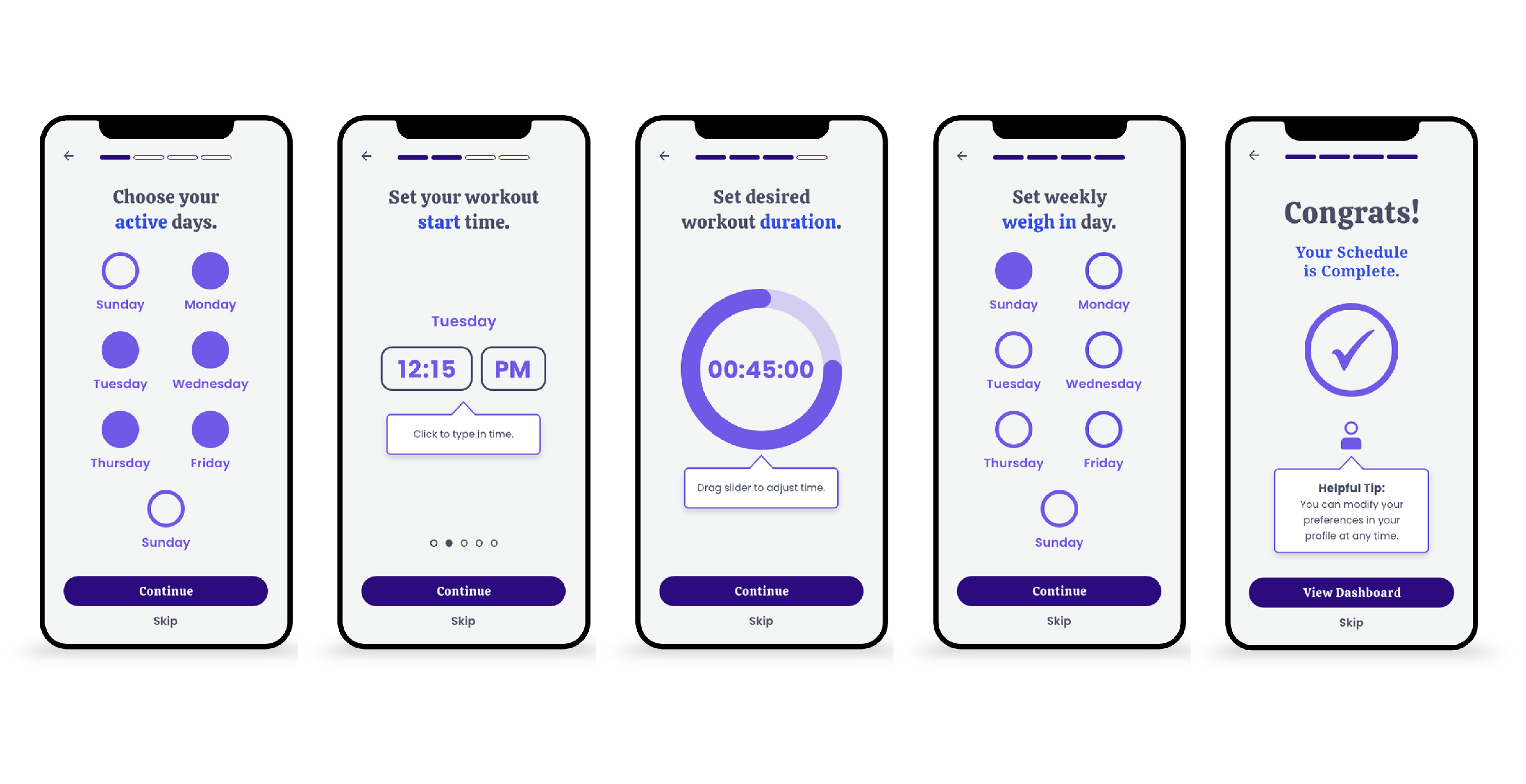 Users want to feel in control of their schedule in terms of days and duration when they complete a workout. Users need guidance when performing exercises to ensure they do not injure themselves and have proper technique.