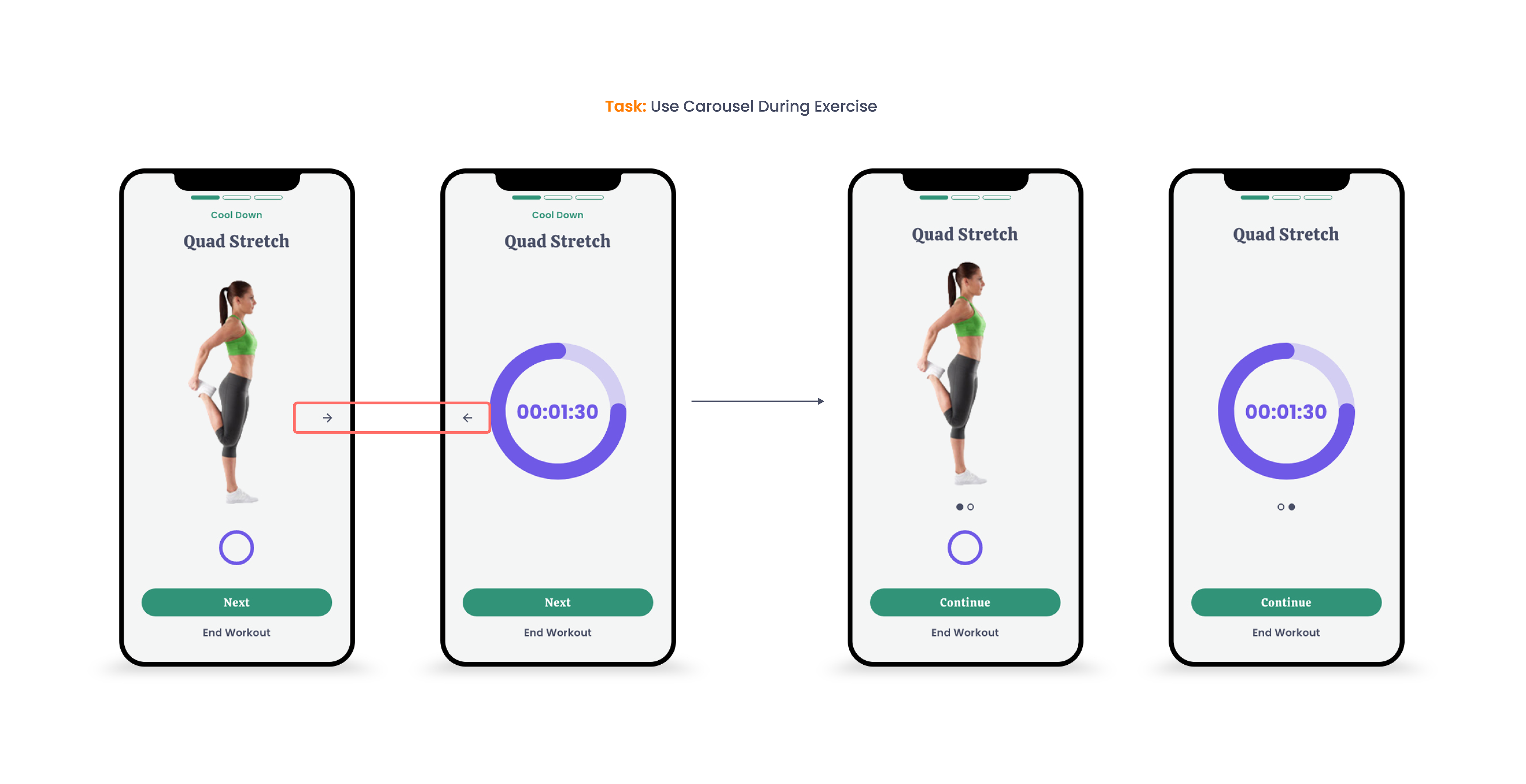 Change verbiage of “Next” to "Continue" on the button to progress to the next exercise. Remove carousel arrows and replace with indicator dots designating between exercise demonstration and timer features.