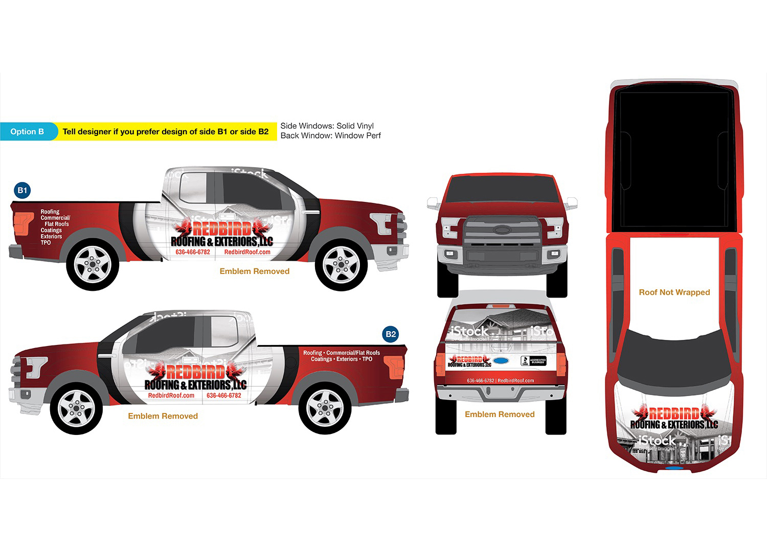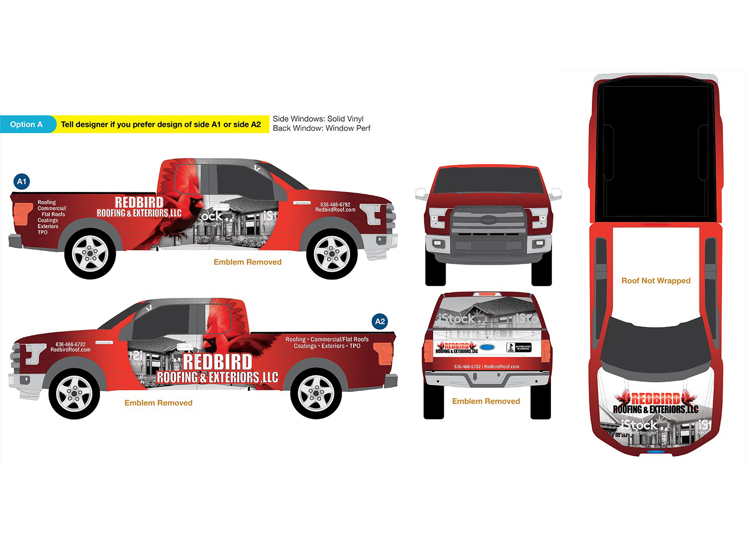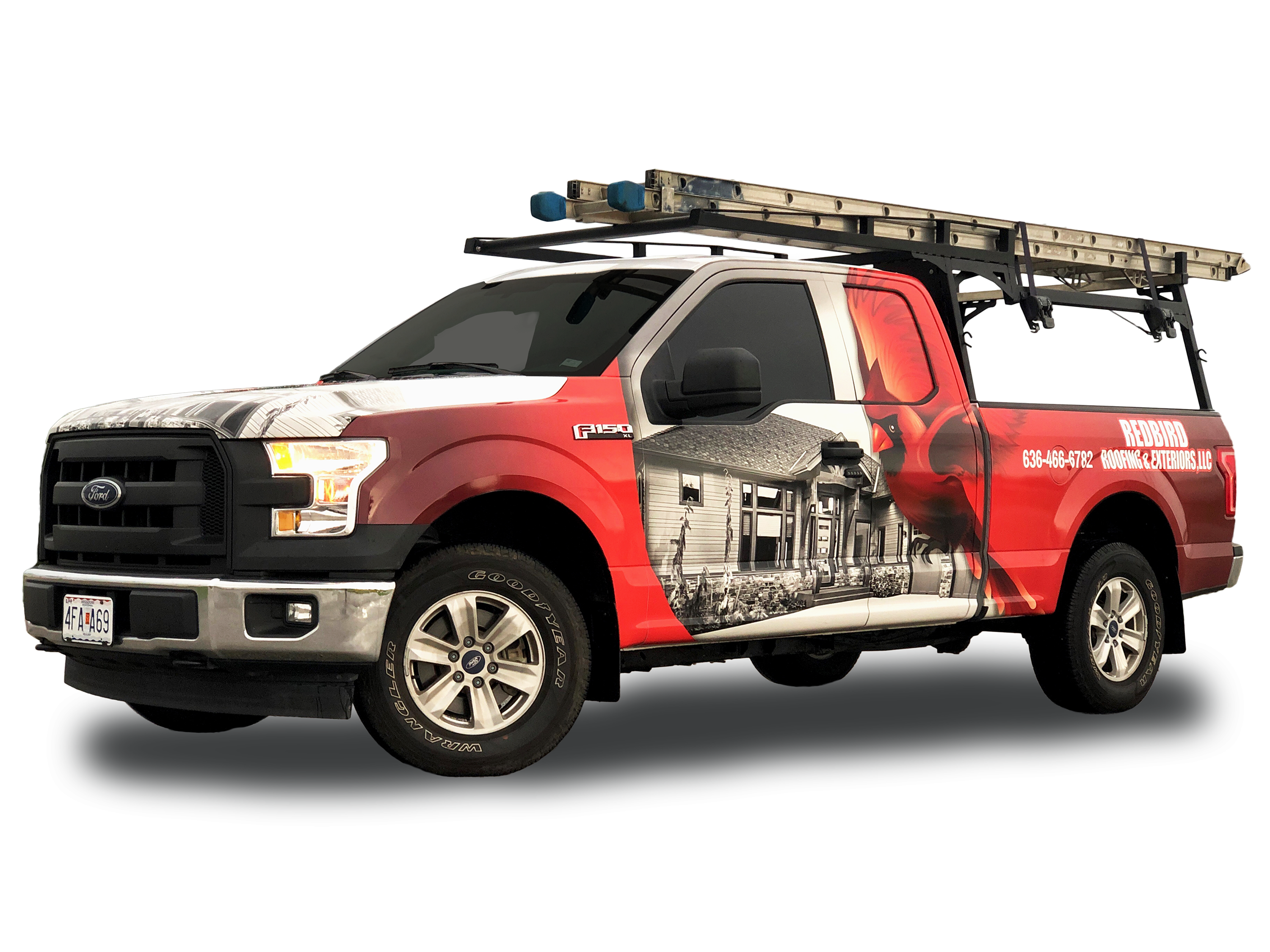 Redbird Roofing and Exteriors is a Missouri-based roofing company looking for an eye-catching vehicle graphic to direct potential clientelle to their website.